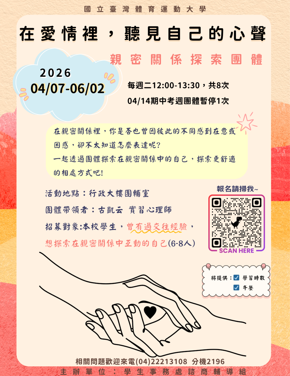 (!!團體擴大招募!!)❤️諮輔活動❤️~「在愛情裡,聽見自己的心聲」-親密關係探索團體~歡迎同學們踴躍報名參加!!