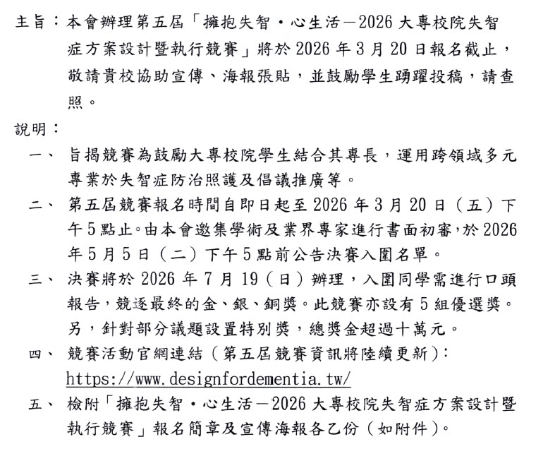 <轉知>2026大專校院失智症方案設計暨執行競賽