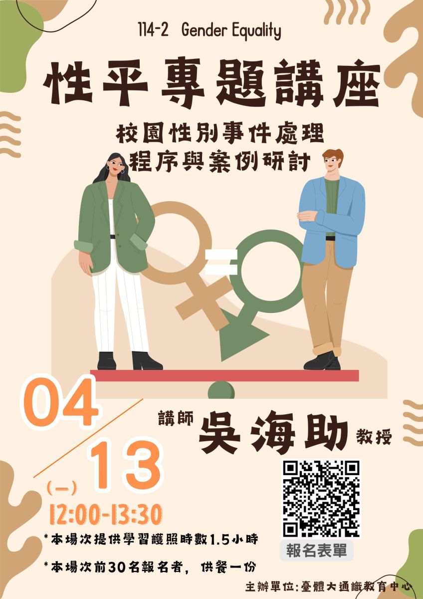 【通識演講】115年4月13日12:00-13:30辦理性平專題講座(講師:吳海助老師),提供時數1.5小時及午餐一份(前30位報名)~