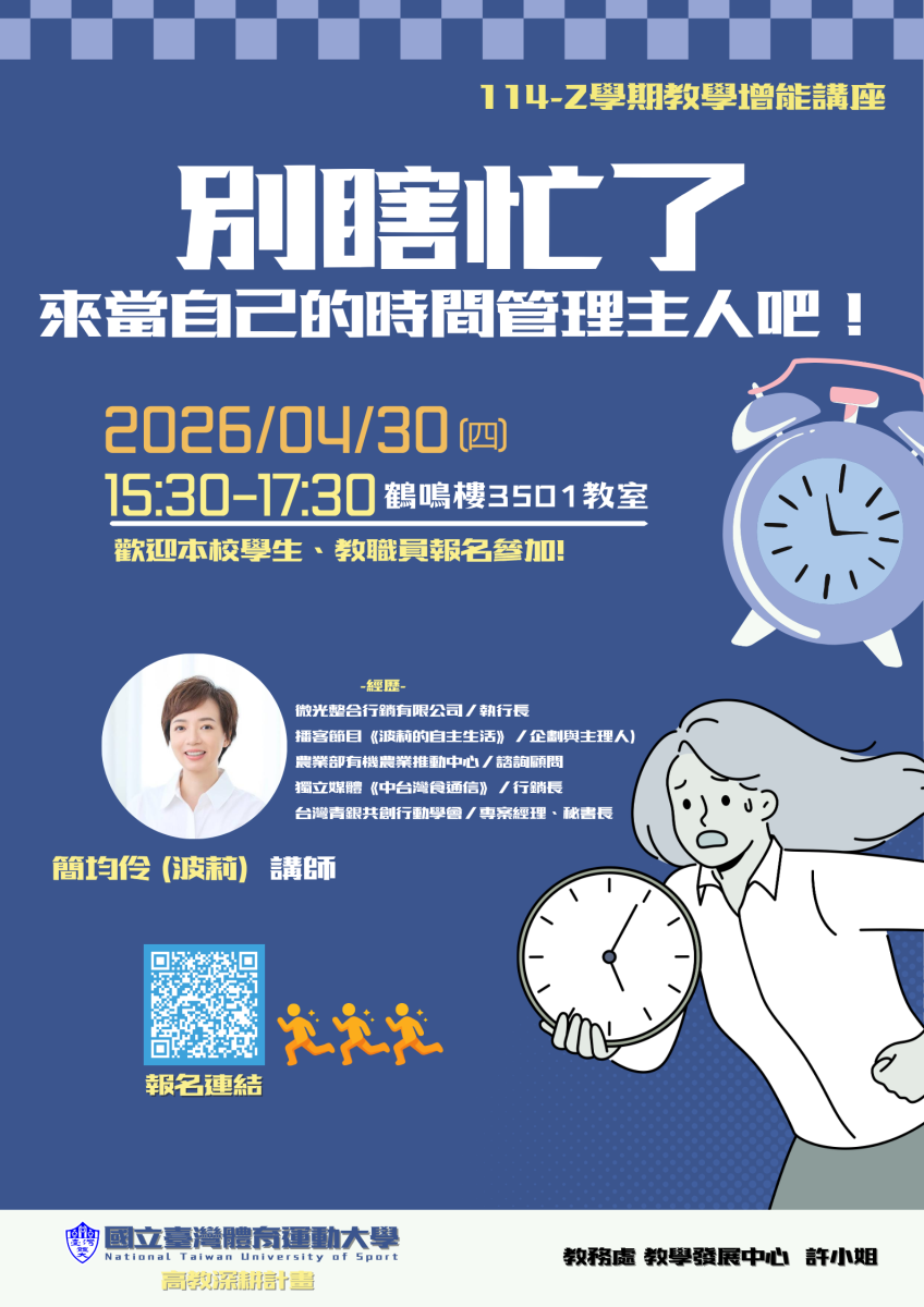 📣<114-2增能講座> 4/30(四)15:30-17:30 波莉(簡均伶)講師主講「別瞎忙了,來當自己的時間管理主人吧!」,歡迎TA、學生及教職員報名參加!