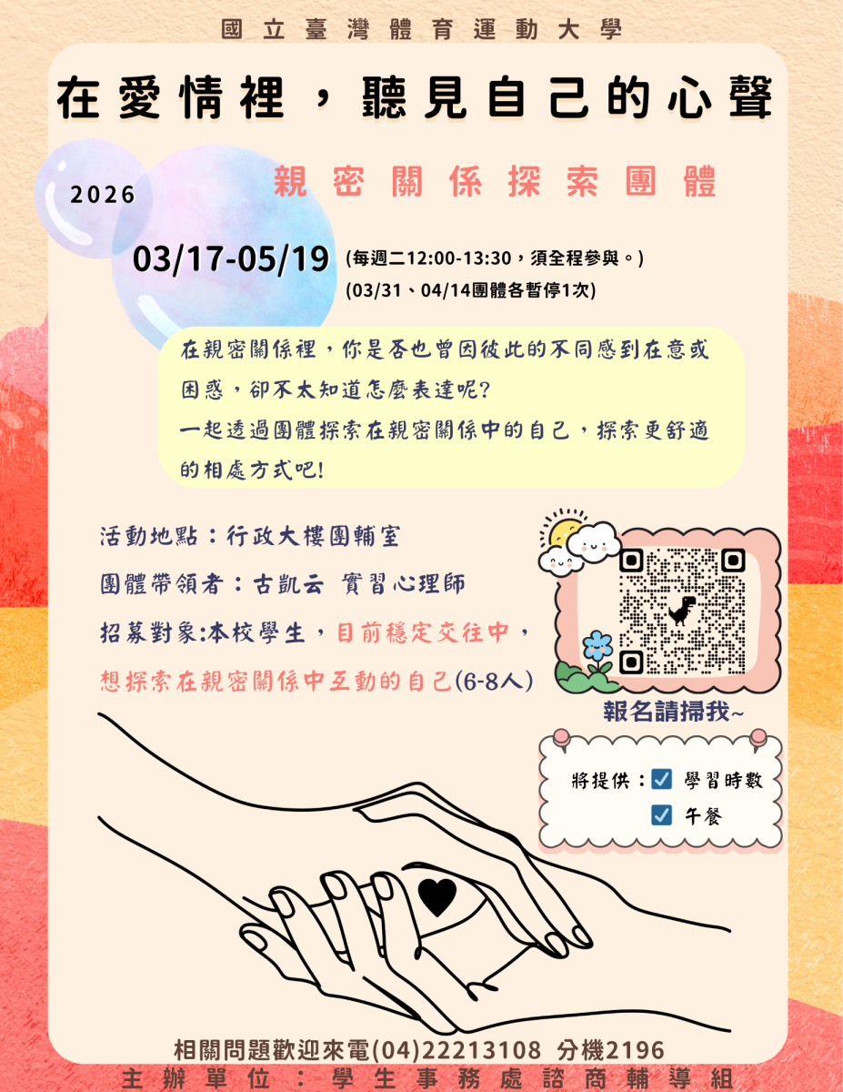 ❤️諮輔活動❤️~「在愛情裡,聽見自己的心聲」-親密關係探索團體開始報名囉~ 歡迎同學們踴躍報名參加!!